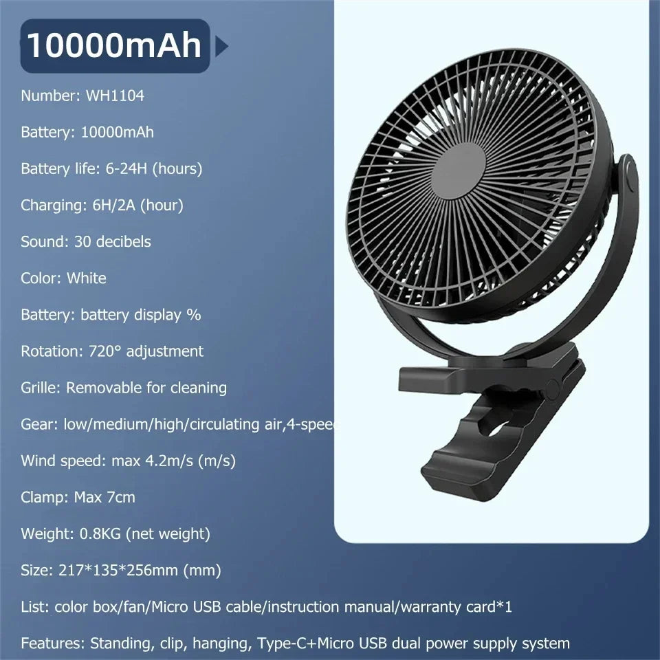 USB Charging Home Room Table Wireless Electric Fan 10000mAh Battery Outdoor Travel Portable Clip Ceiling Fan 4 Speed Adjusted