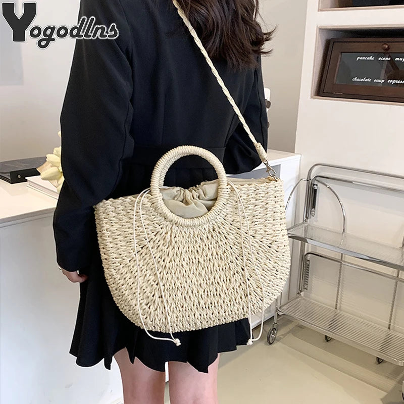 Straw Handbags for Women Summer Beach Bags Vintage Casual Shoulder Bags Women High Capacity Shopper Totes Moon Crossbody Bags