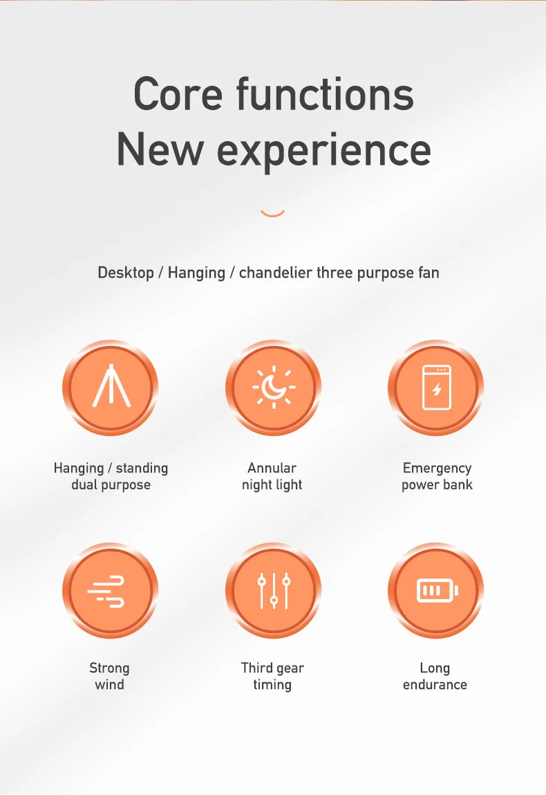 Stay cool anywhere with this 2025 rechargeable camping fan, designed with a powerful 10000mAh/4000mAh battery for long-lasting performance. Featuring 3 wind modes (natural, sleep, prevailing) and rotary vane air supply, this portable fan doubles as a wireless ceiling or desktop fan with built-in LED lighting. Perfect for camping, outdoor adventures, or emergency use, it offers whisper-quiet operation, adjustable speed, and up to 8+ hours of cooling.