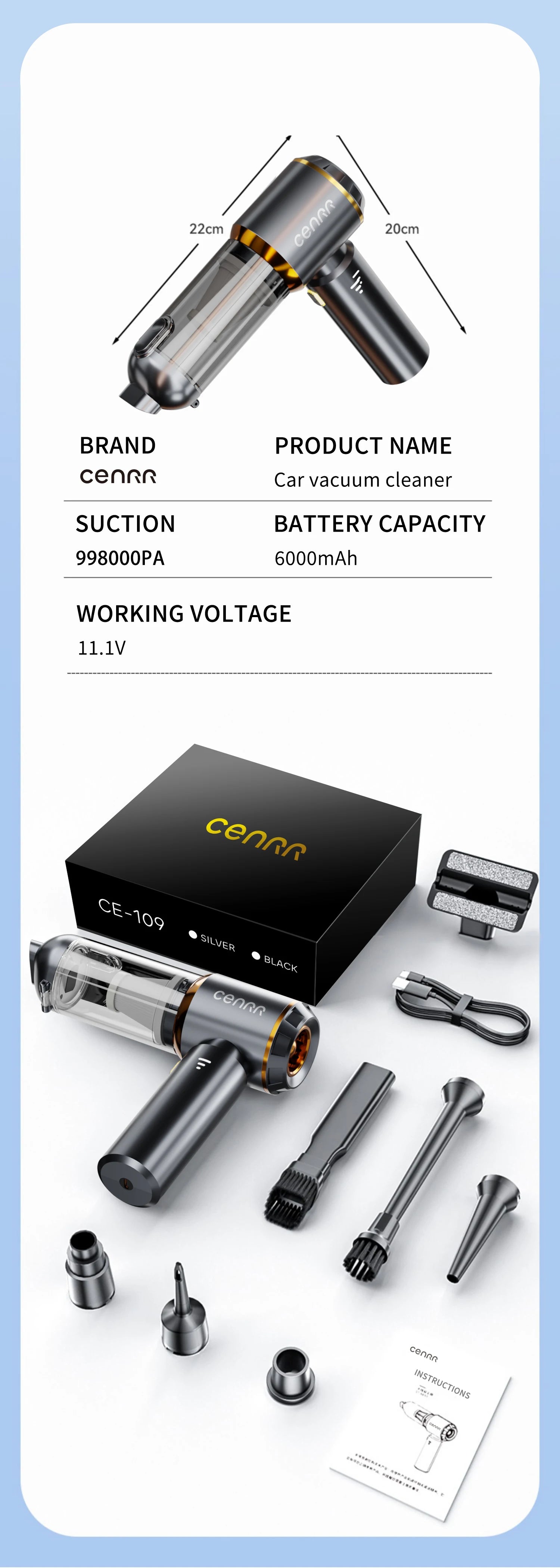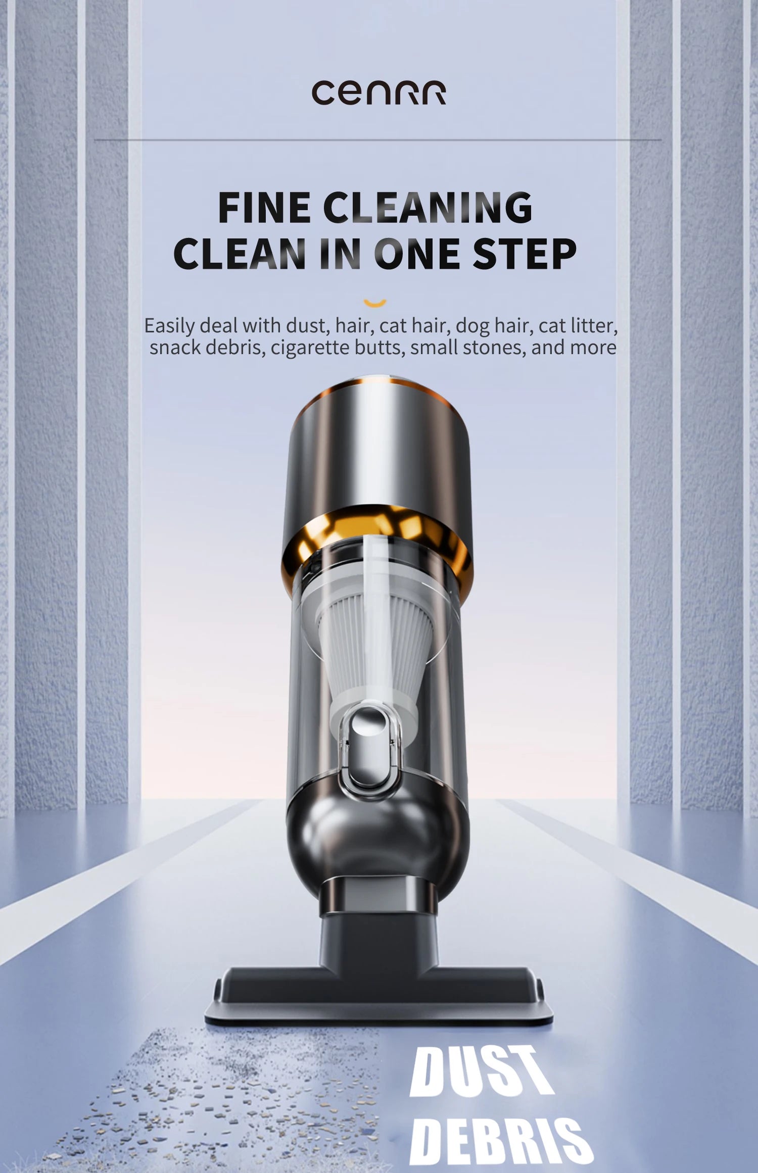 Keep your car spotless with the CENRR 998000PA Cordless Mini Car Vacuum Cleaner. Designed for powerful suction up to 998000PA, this wireless handheld vacuum makes cleaning quick and effortless. Equipped with a HEPA filter, multiple nozzles, and wet & dry functionality, it easily removes dust, crumbs, and spills. Compact, lightweight, and rechargeable, it’s the perfect portable cleaner for your vehicle and home.