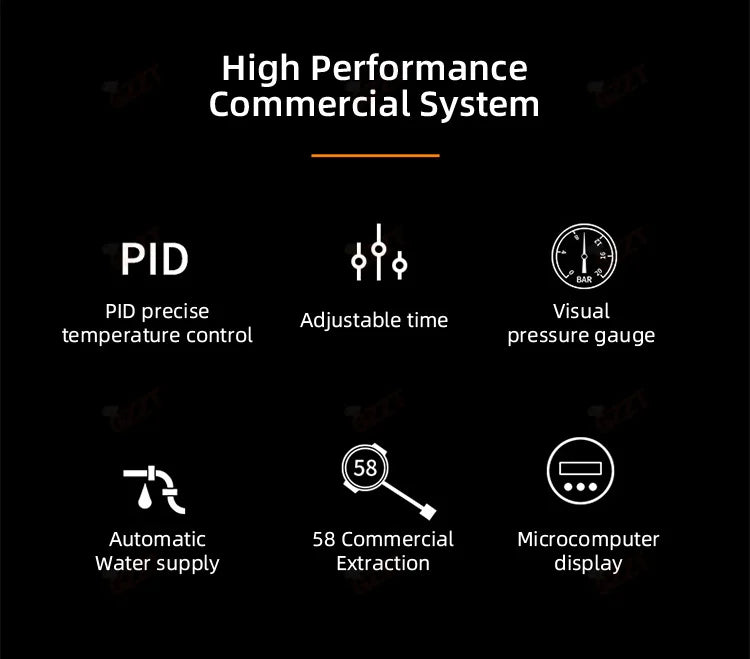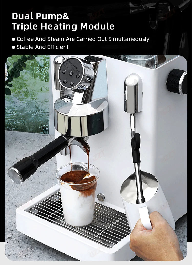 Brew professional-quality coffee with the GZZT CM6005 Commercial Coffee Machine, engineered for cafés, restaurants, and serious home baristas. Featuring a double pump system and triple heating technology, this 3100W powerhouse delivers consistent pressure and temperature stability for rich, aromatic espresso. Its PID intelligent control system ensures precise heat management, while the built-in microcomputer enhances efficiency and reliability. With dual operation capacity, the CM6005 is perfect for high-volume environments where speed and quality matter.