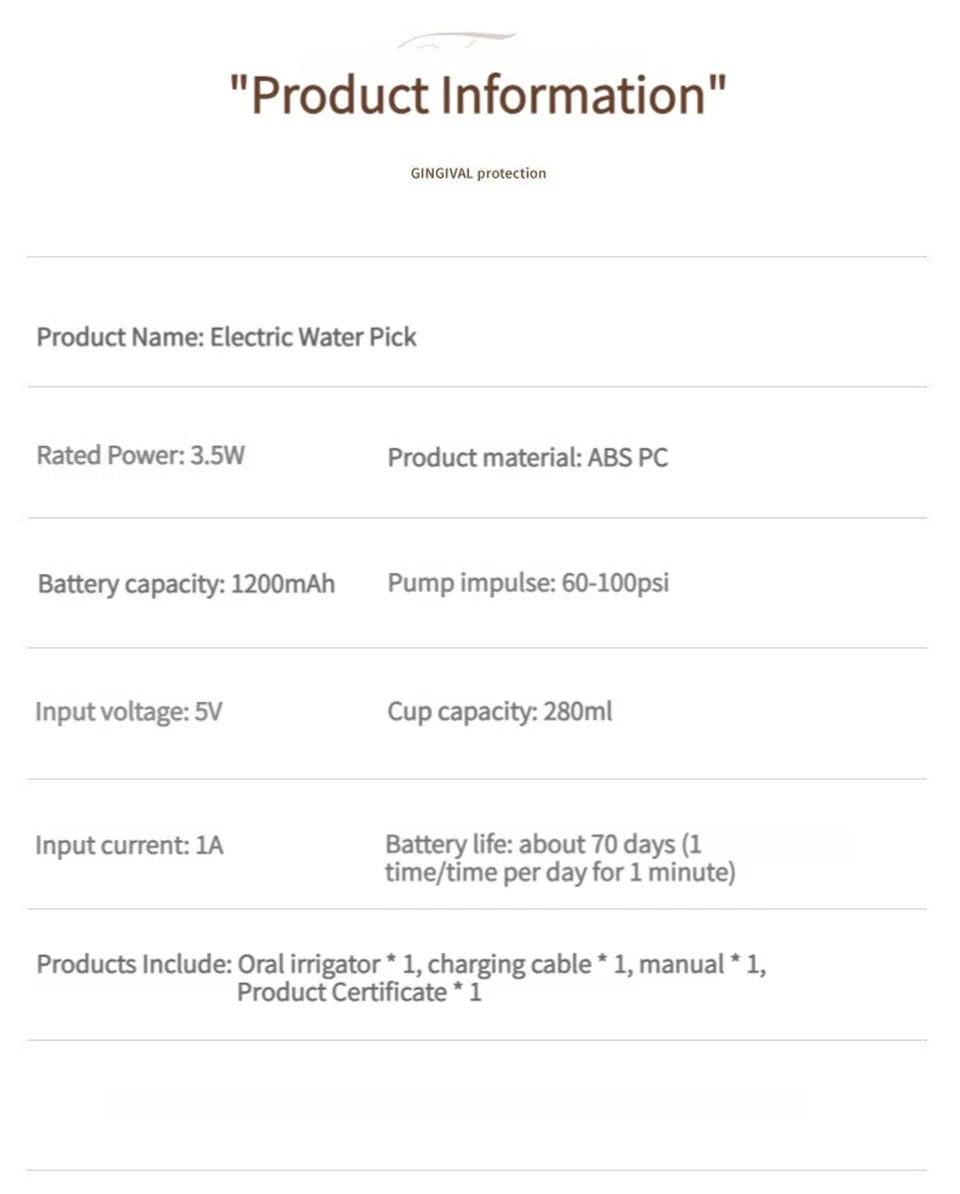 • Item Type: Electric Oral Irrigator / Water Flosser