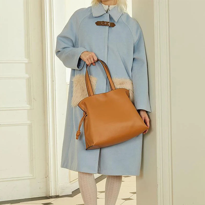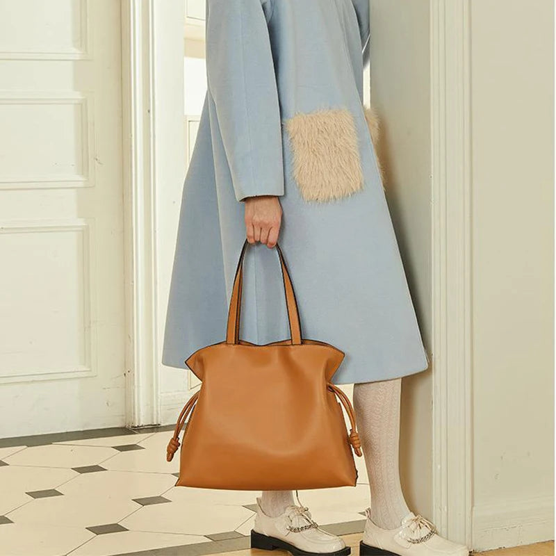 Women’s Cowhide Leather Lucky Bag – Pleated Drawstring Tote
